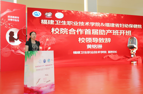 黄铭珊在讲话中感谢福建省妇幼保健院给予我校大力支持与帮助,并指出校院合作、产教融合是职业教育办学的重要类型特征,是职业教育高质量发展的生命线,更是”双高校“建设发展的重要模式,同时对校院合作班的学生们寄予厚望,希望同学们珍惜学习机会,虚心求教,积极进取,注重实践,知行合一。