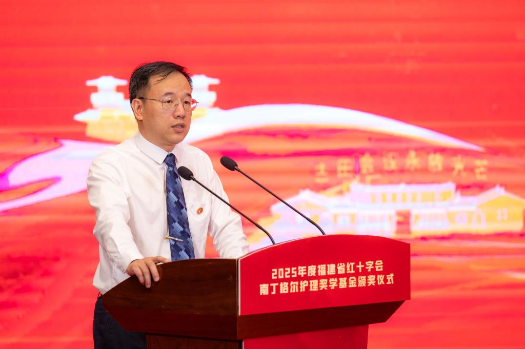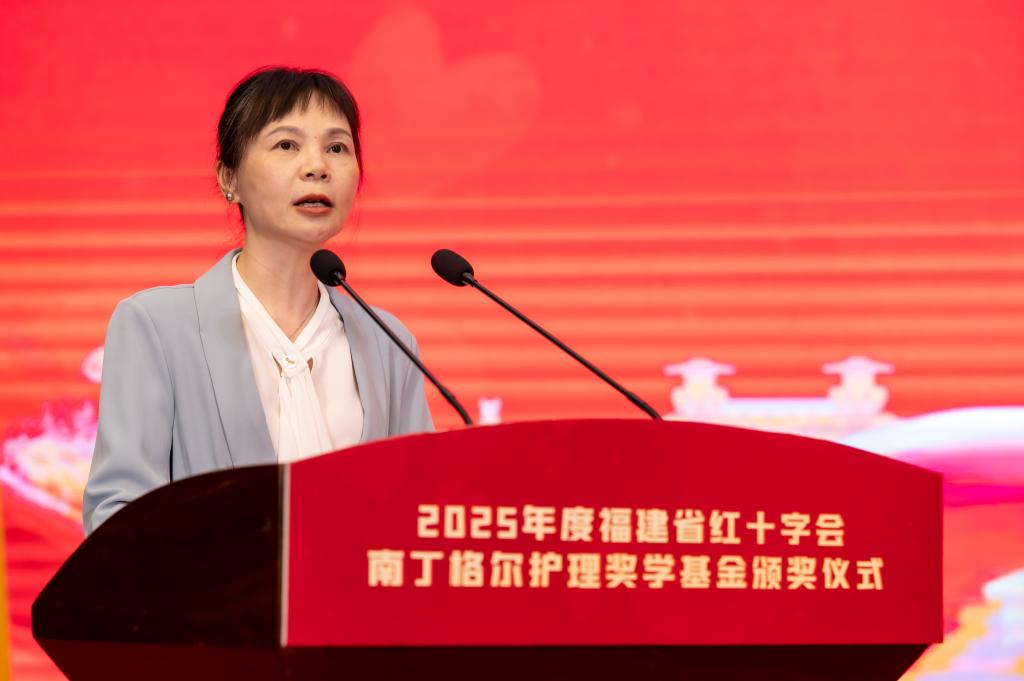 杨飞燕宣读《关于颁发2025年度福建省红十字会南丁格尔护理奖学基金奖励的决定》,30名获奖学生代表分批走上舞台,接受颁奖。