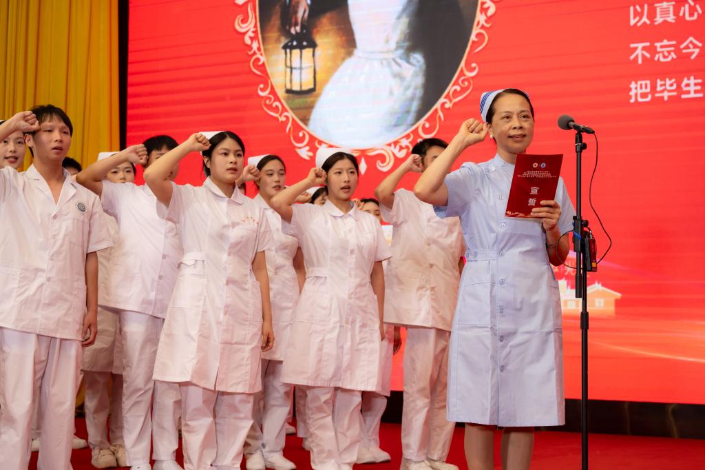 在护理学院护理专业带头人郑翠红教授领誓下,获奖学生集体宣誓,以“终身纯洁,忠贞职守”的南丁格尔誓言,许下对护理事业的庄严承诺。