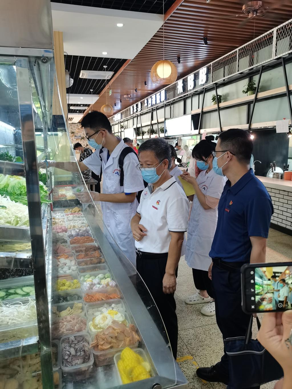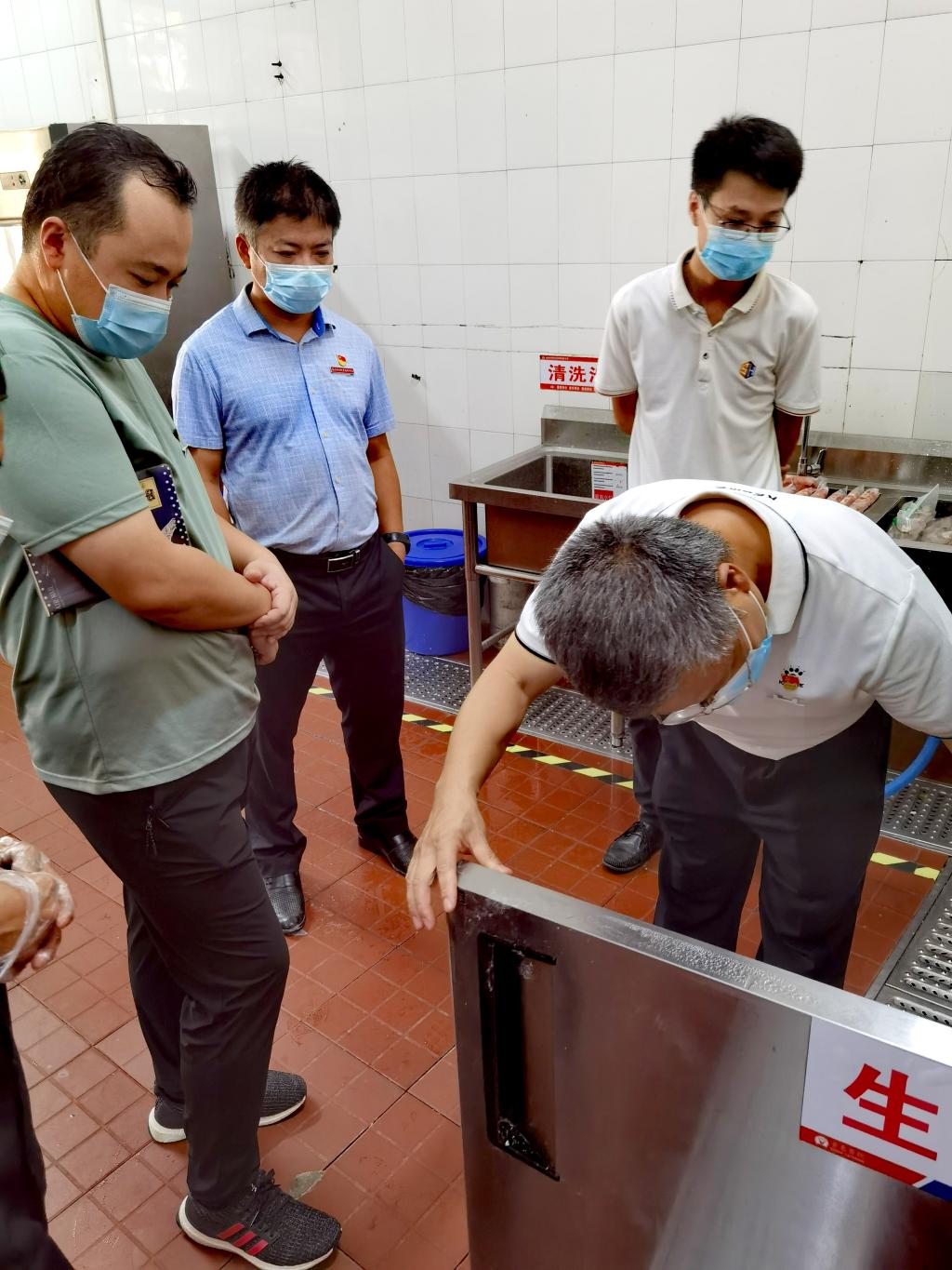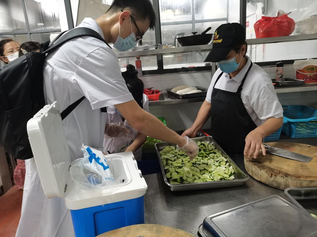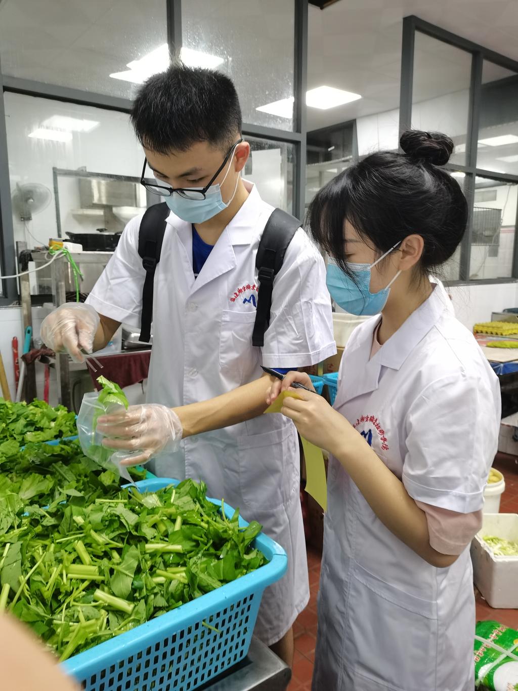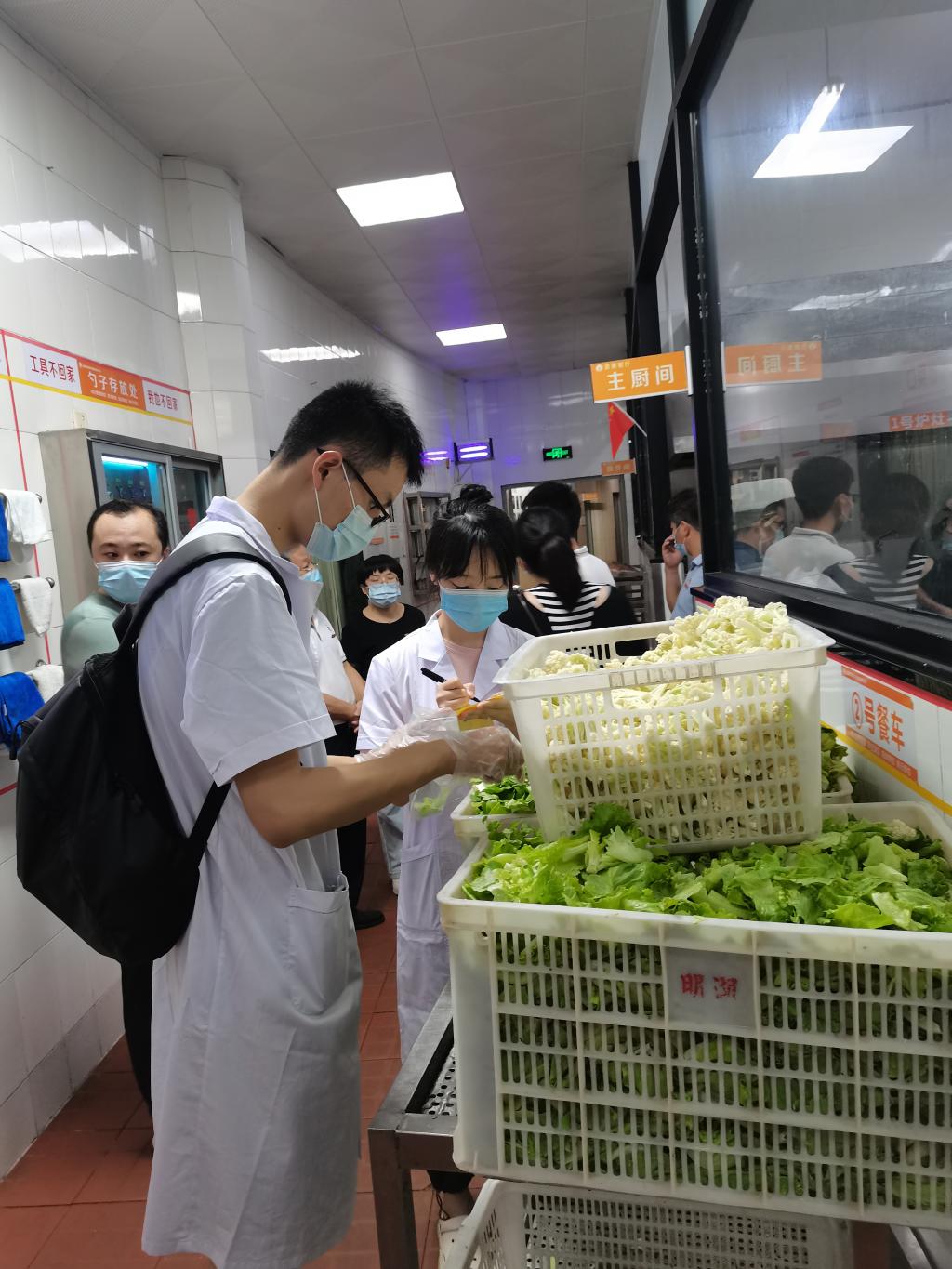 食品质量检测小组随机抽取各食堂当日切洗浸泡后的蔬菜包括空心菜、黄瓜、花菜、娃娃菜、生菜、上海青等蔬菜,将取样带回实验室开展检测工作。同行的领导与党员同志对食堂的食品留样、健康证、消毒、食品存储和餐具卫生等情况进行重点检测,现场办公提出可行的改进措施,并立整即改,全力保障师生的饮食健康与食品安全。