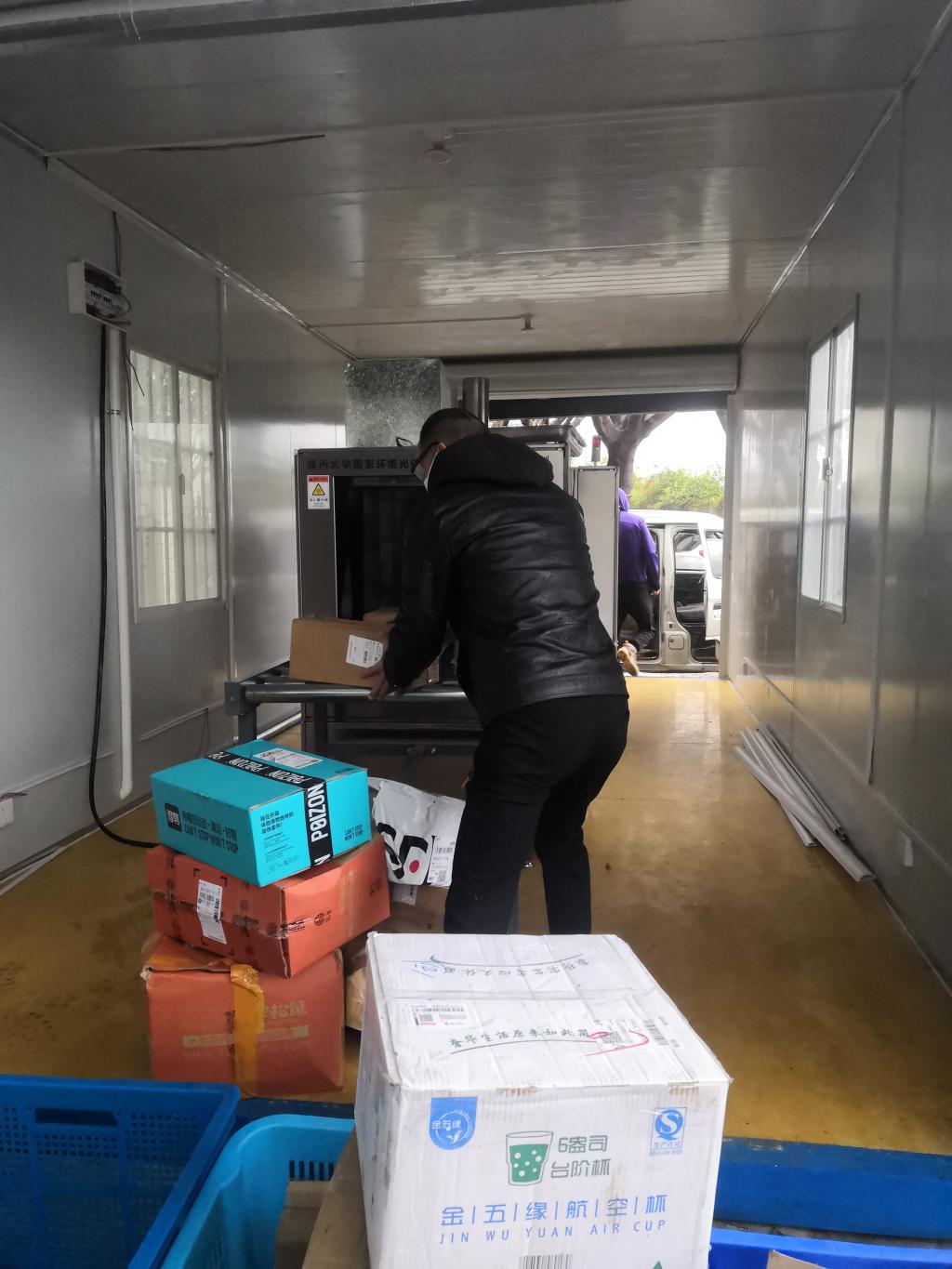 该消杀工作站配备的紫外光催化复合消杀设备采用消杀能力最强的254nm波长紫外线光源,具有快速高效无污染的消杀特点,每小时可消毒2000件货物。所有进校的快递在校门外中转站进行消毒液喷雾消毒后,再转运至紫外光催化复合消杀工作站进行二次消毒。冷链食品通过紫外光催化复合消杀后再入库储藏。该工作站的启用,为校园防疫消杀增添了新利器。