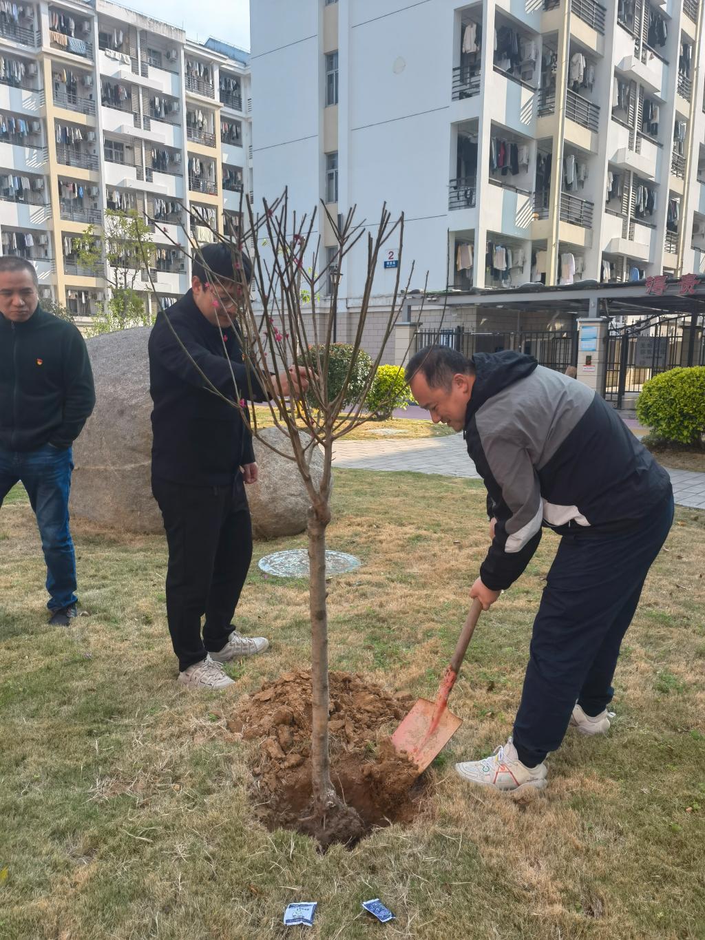 活动现场气氛热烈,支部党员同志分工协作,配合默契,大家挥锹铲土、扶苗培土、提水浇灌,合力栽下红梅、红枫等十余株,新栽苗木迎风挺立,在春日暖阳中展现勃勃生机。