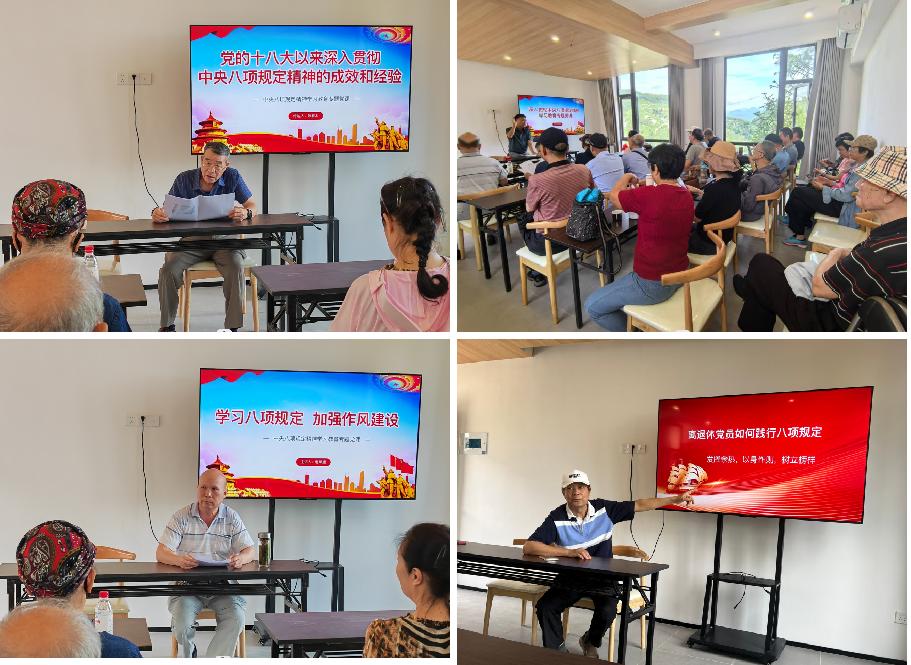 银发丹心有担当。为进一步营造学习氛围、强化学习成效,党总支书记、党支部书记分别以学习传达《党的十八大以来深入贯彻中央八项规定精神的成效和经验》《学习八项规定加强作风建设》《永葆本色 银发生辉》为主题讲授专题党课,以讲促学,引导离退休党员要坚持锤炼党性、提高思想觉悟,始终做到“离岗不离党、退休不褪色”。