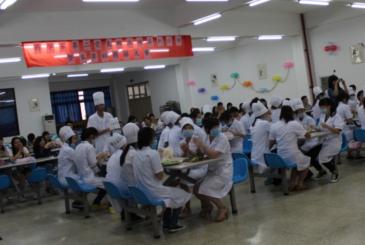 5月15日下午,药学系第二党支部立项系列活动之“药学系首届“健康杯”药膳烹饪大赛”在院教工餐厅隆重举行。莅临大赛现场的评委有:药学系副主任肖健老师、福州乐家老铺药事服务有限公司副总经理林平先生、药学系第二党支部书记何舒澜老师、支委潘雪丰老师、中药教研室主任罗兰老师、药学系办公室主任林颖峰老师、药学系团总支书记王钝锐老师以及中药教研室的林玲老师和林贵灿老师。除了参赛的药学系各专业学生8支代表队,亲临比赛现场还有本草社的全体成员和为代表队们呐喊助威的同学们,一时间,教工餐厅里观众云集,热闹非凡。