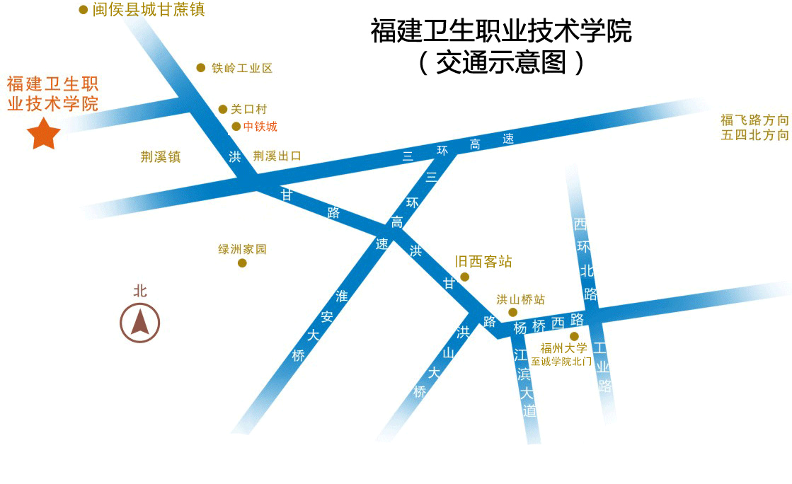 2.自驾车路线:①从三环路往南平、闽侯方向到荆溪出口(闽侯县城、洪甘路)下,右转沿洪甘路朝闽侯县城方向约3.5公里至福建卫生职业技术学院。②市内往甘洪路向闽侯县城方向行驶至福建卫生职业技术学院。