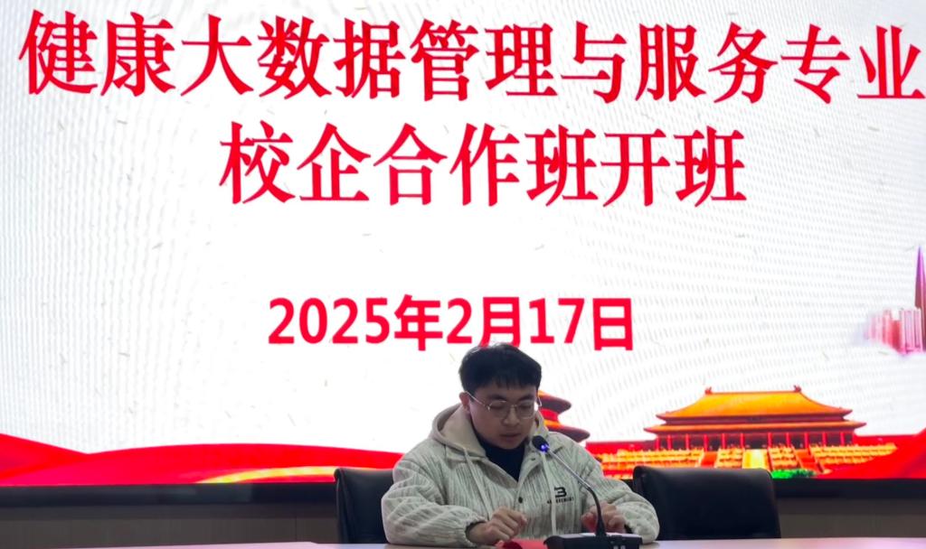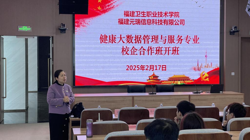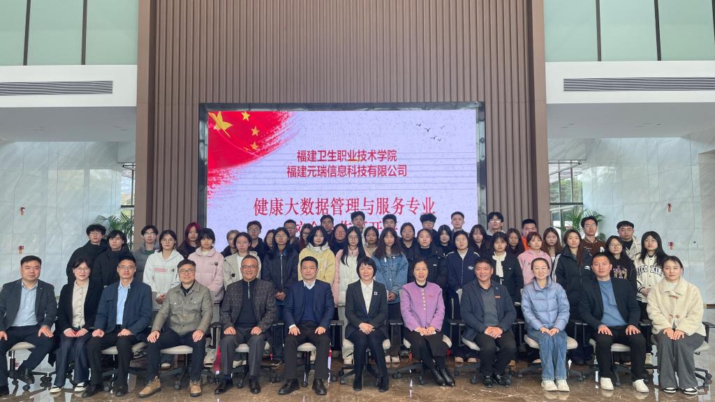 2月17日,我校第一届健康大数据管理与服务专业“校企合作班”开班仪式在国家东南健康医疗大数据中心隆重举行。福建元瑞信息科技有限公司总经理陈伟林、常务副总徐锦元、副总经理李昱、各部门负责人,学校党委副书记李美华,健康学院领导班子成员、健康大数据教研室专任教师、辅导员以及23级健康大数据管理与服务301班的学生共同参加开班仪式。