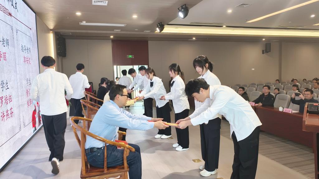 学生向各自导师行礼、呈拜师帖、献花