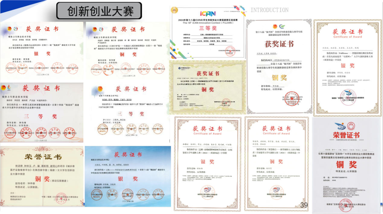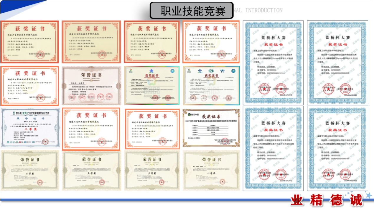 学生获得全国医用电子仪器技术职业技能大赛个人二等奖1项、个人三等奖1项、团体三等奖2项,2022-2023“一带一路”暨金砖国家技能发展与技术创新大赛一等奖和最佳组织奖1项,第十八届“振兴杯”全国青年职业技能大赛学生组创新创效竞赛全国决赛铜奖1项,福建省职业院校技能大赛集成电路开发及应用赛项二等奖3项、三等奖1项,福建省职业院校技能大赛物联网技术应用赛项三等奖2项、福建省职业院校技能大赛智能电子产品设计与开发赛项二等奖1项、福建省第二届国锐杯增材制造技术综合应用技能大赛三等奖1项,“挑战杯”福建省大学生课外学术作品竞赛三等奖2项,“挑战杯”福建省大学生创业计划竞赛银奖2项、铜奖1项,福建省“互联网+”大学生创新创业大赛银奖1项、铜奖1项,中国(福建)女大学生创新创业大赛铜奖1项、福建省大学城创新大赛(2024)银奖1项、铜奖1项,2022一带一路暨金砖国家技能发展与技术创新大赛浙区域赛二等奖、海峡两岸大学生职业技能大赛物联网技术应用赛项三等奖2项、智能硬件开发与应用一等奖1项、二等奖1项。码蹄杯全国大学生程序设计大赛职业院校赛道省赛金奖1项、铜奖4项、第十五届蓝桥杯全国软件和信息技术专业人才大赛福建赛区Python程序设计三等奖2项、物联网设计与开发大学组三等奖1项、单片机设计与开发职业院校组三等奖1项。学生参与教师科研,获国家专利2项,国家计算机软件著作权证书4项。