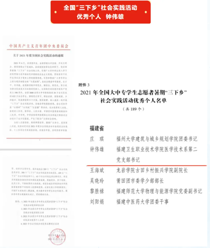 专业教师2021年研发“一种便携式超声诊断仪”申报国家发明专利(专利号:202010734371.8),组建“医+红梦队”学生团队,参加2021年暑期“三下乡”社会实践活动,深入福建三明尤溪,为村民带去义诊关爱。