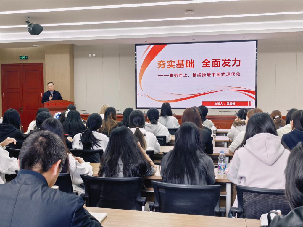 为深入学习贯彻党的二十届四中全会精神,准确把握国家“十五五”规划的战略部署,进一步凝聚思想共识、强化使命担当,3月16日至19日,校党委书记曾武祈、校党委副书记李美华、纪委书记林玲和副校长黄铭珊、周雄、朱扶蓉纷纷走上讲台,为我校上千名党政干部和师生代表讲授形势政策课。