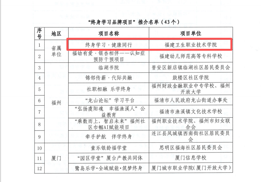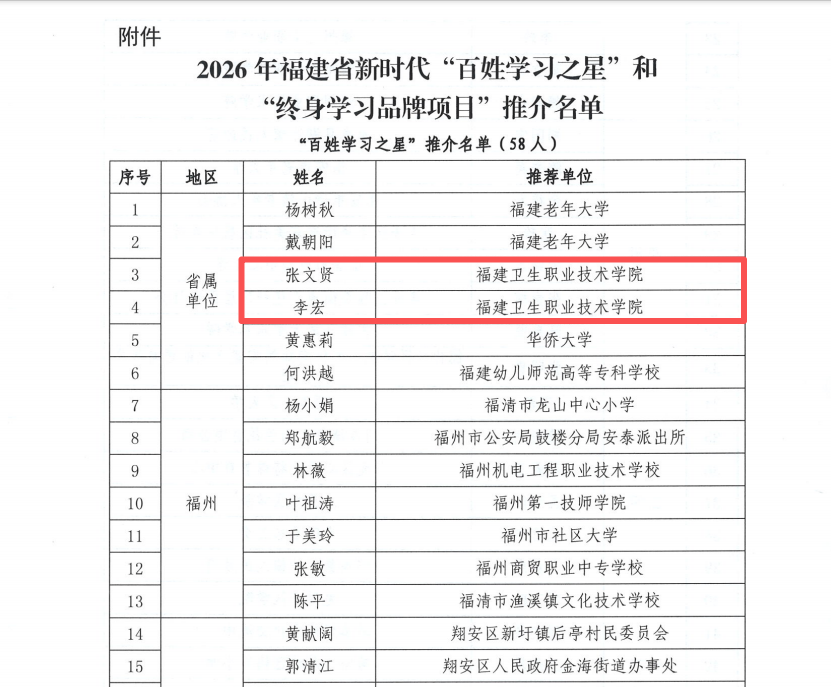 近日,福建省终身教育促进委员会公布2026年“百姓学习之星”和“终身学习品牌项目”推介名单。我校医学技术与工程学院张文贤老师、公共卫生与健康管理学院李宏老师入选“百姓学习之星”,公共卫生与健康管理学院申报的《终身学习·健康同行》入选“终身学习品牌项目”。
