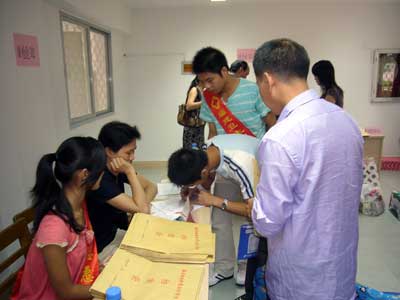 报到当天,彩旗招展,“丹桂飘香共祝美好明天” 的火红条幅迎风飘悬。我系将报到处和咨询处置于7号学生会议室,并用红榜张贴新生名单、报到流程图、缴费说明、学籍说明等,为新生及家长提供方便快捷的服务。