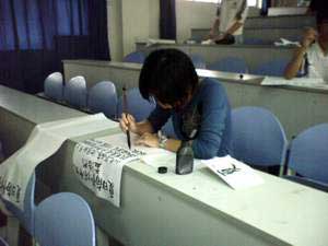 为丰富同学们的课余活动,提高对中国书法的鉴赏能力,同时发掘系部书法方面的优秀人才,检验影像系于2007年10月11日下午4:00在系二阶教室举行书法比赛。本次比赛共收到参赛作品50余件,其参赛作品之多,书法技艺之高超,令评委惊喜。经过评委的认真评选,最终评出一等奖2名,二等奖4名,三等奖6名,优秀奖8名,所有的获奖者都将获得相应的素质拓展加分。(检验影像系)
