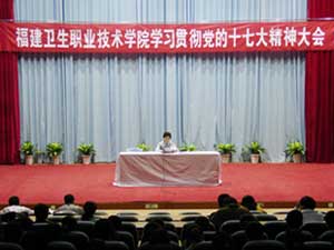 10月30日我院在学术厅召开学习贯彻党的十七大精神全体教职员工大会。严肃书记传达了全省教育系统学习贯彻十七大精神座谈会精神,重点传达了省委常委、教育工委书记陈桦讲话精神,并就我院认真学习、深入贯彻十七大精神提出了三点意见:一是要周密部署,认真研读十七大报告,准确把握会议精神,将其纳入党团活动,积极开展进教材、进课堂、进学生头脑工作;二是要营造良好氛围,充分利用学院的宣传阵地,搞好十七大精神的宣传工作,加强理论研究,开好思研会,掀起学习十七大精神的热潮;三是要学以致用,用科学发展观统领学院各项工作,认真抓好今年底和明年初的各项工作,谋划好明年工作,用十七大精神促进我院又好又快发展。