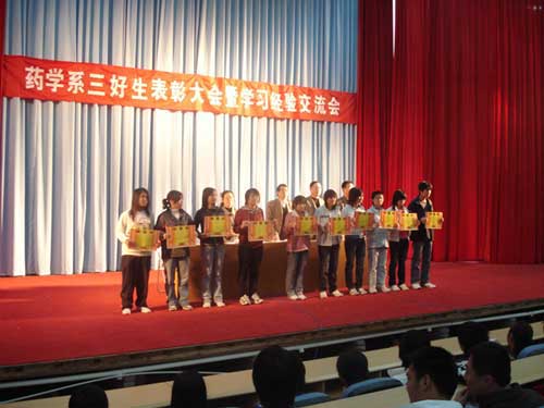 2007年 4月 10 日,我系于图书馆学术厅召开 2006~2007学年第一学期三好生表彰大会暨学习经验交流会,学工处处长郑力宏,药学系书记欧春木,药学系主任陈穗和药学系秘书艾松军出席了大会,大会由艾松军主持。