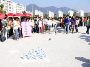 2007年2月6日下午阳光明媚,由福建卫生职业技术学院学生会主办,药学系学生会承办的福建卫生职业技术学院“迎新春”趣味活动在院体育场举行,学工处郑力宏处长、团委邱滚忠老师、药学系欧春木书记等领导出席,邱滚忠老师代表学院讲了话,他带来了院领导的关怀,对药学系承办此次活动所付出的辛苦表示感谢,并预祝活动圆满成功。药学系欧春木书记就此次活动的筹备做了讲话。此次活动有来自各系部的15支代表队,345名运动会参加,活动的项目有情牵一线、移砖过河、齐心协力、可乐保龄球、腰力大比拼、团体拔河等,各系部组织了强有力的啦啦队现场比拼,活动热浪一潮高过一潮。冬天的太阳虽然不烈,但运动员个个仍汗流浃背,此次活动还吸引了数千名的体育爱好者。这是我院在紧张的期末复习考试期间进行的又一次心情大调节,此类活动深受学生的喜爱。