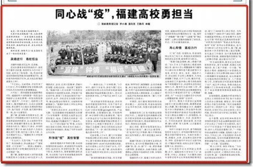 海峡教育报讯 4月2日,《福建日报》第四版刊发了《同心战“疫”》文章,介绍了我省高校从医疗救治到驰援一线,从检测研发到科学预防……面对疫情,迎难而上,交出了一份出色的答卷!