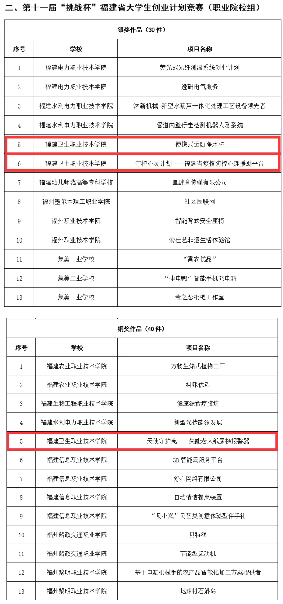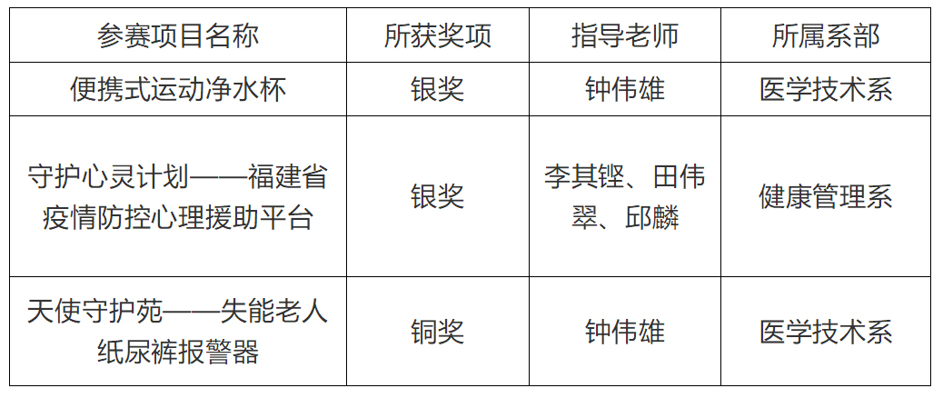 近日,第十一届“挑战杯”福建省大学生创业计划竞赛决赛在云端开赛。福建卫生职业技术学院参赛项目 “便携式运动净水杯”、 “守护心灵计划——福建省疫情防控心理援助平台”获得银奖,“天使守护苑——失能老人纸尿裤报警器”获得铜奖。