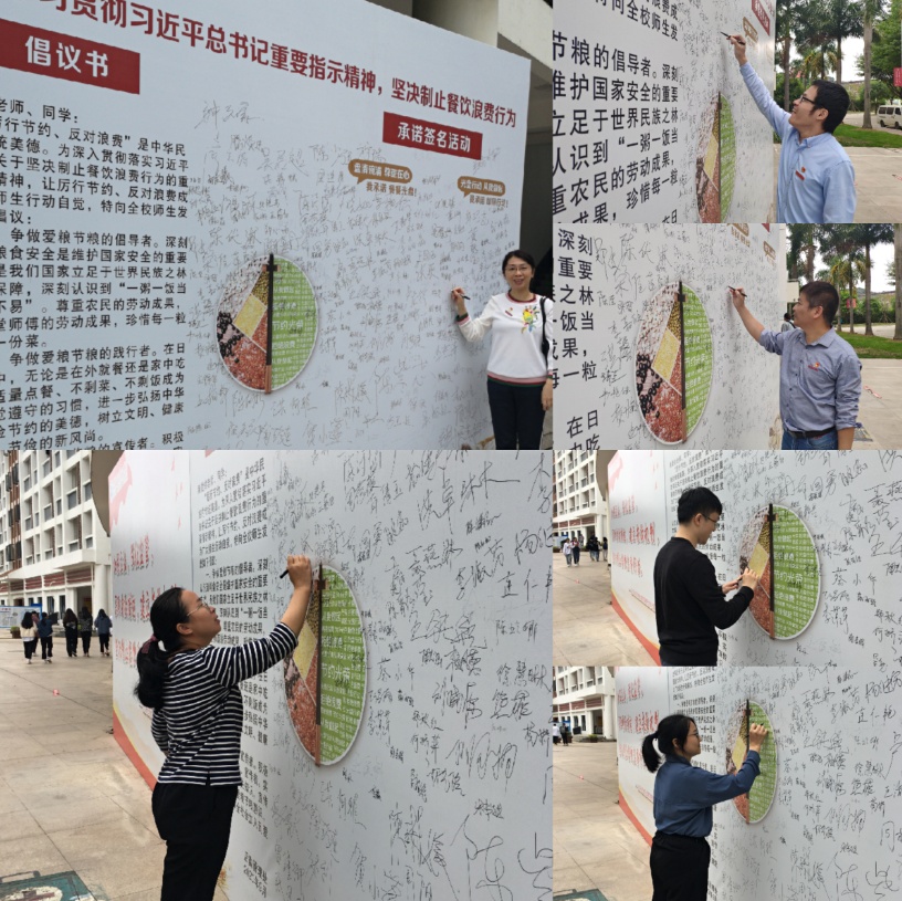 师生积极响应习近平总书记对制止餐饮浪费行为重要指示精神倡议,签名承诺厉行节约珍惜粮食,用实际行动践行光盘。米粒虽小,尤见礼义廉耻;节俭事微,可助兴国安邦,我们要树立珍惜粮食的意识,践行爱惜粮食的理念。节约粮食,从我做起,从现在做起!