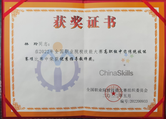 赛中,学校药学院领导线上线下一路悉心陪护,为选手在比赛中做好心理辅导,不断调整最佳状态,最终选手以扎实的专业水平与规范的技能操作,从全国51支参赛队伍中脱颖而出,一举获得全国一等奖的优异成绩,林玲老师获得“优秀辅导教师”称号。