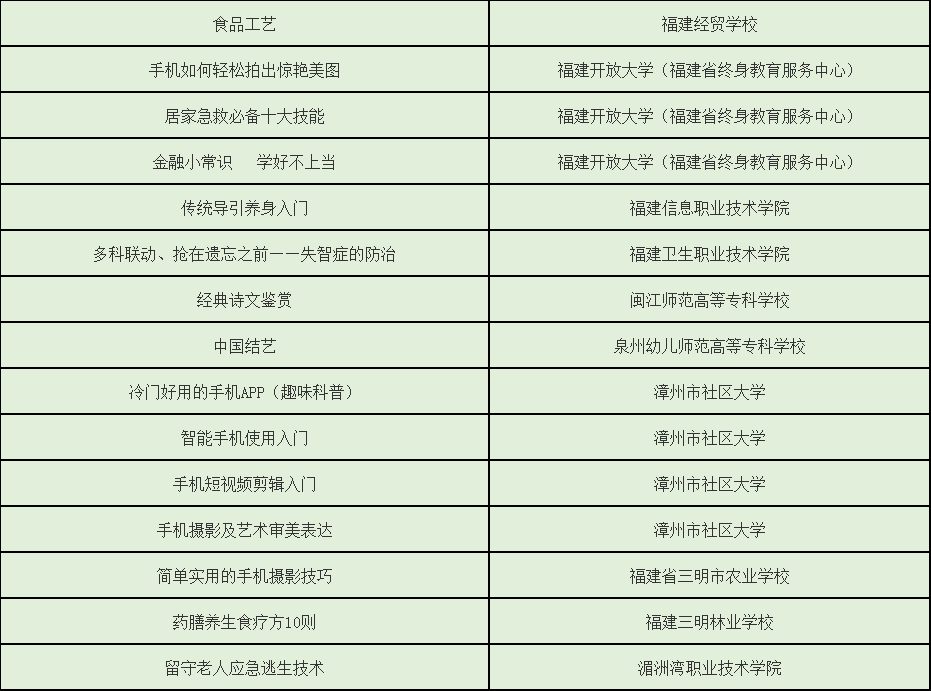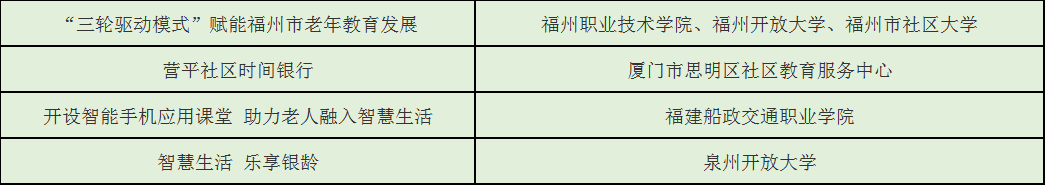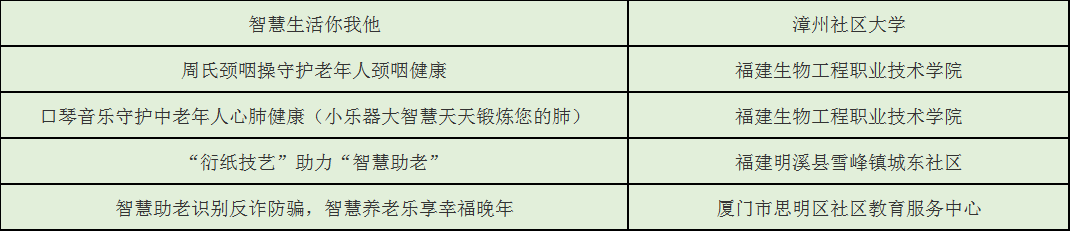 “智慧助老”优质教育培训项目中,漳州社区大学的《智慧生活你我他》等5个项目入选。