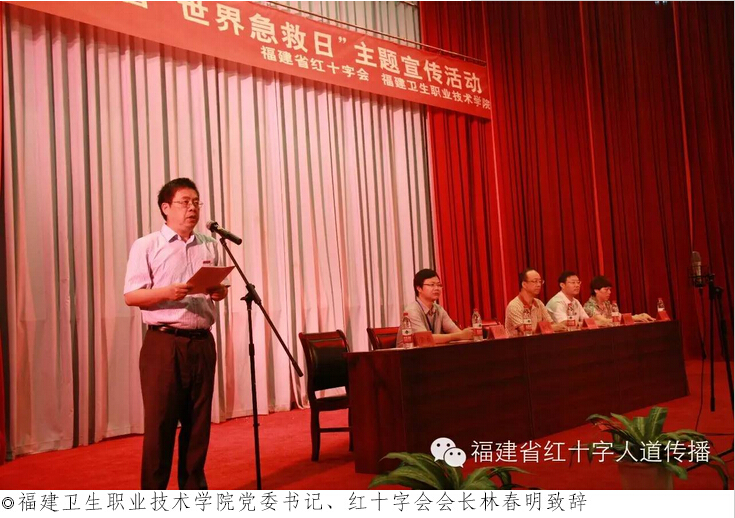 9月12日是第16个“世界急救日”,今年的主题是“急救与老龄化人群”。上午,由福建省红十字会主办、福建卫生职业技术学院红十字会承办的“2015年‘世界急救日’系列活动启动暨福建卫生职业技术学院红十字敬老志愿服务队成立仪式”在福建卫生职业技术学院学术厅举行,福建省红十字会党组书记、常务副会长黄毅敏,省红十字会副秘书长蔡康政,福建卫生职业技术学院党委书记、红十字会会长林春明,卫生职业技术学院红十字会秘书长宋维出席活动仪式。