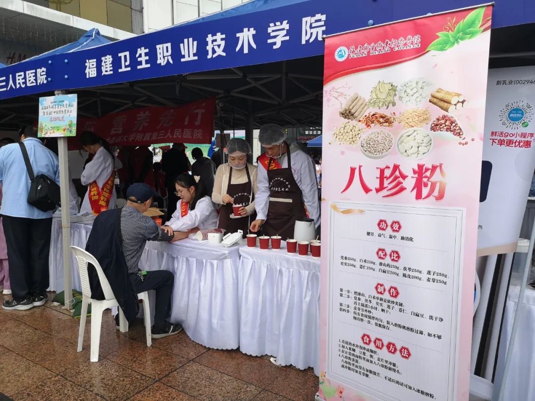 福建卫生职业技术学院医学营养专业的老师和同学们带来了古方八珍粉,冲泡给大家试喝:“这个方子可以健胃、益气、温中、助消化,很适合现在饮用。”