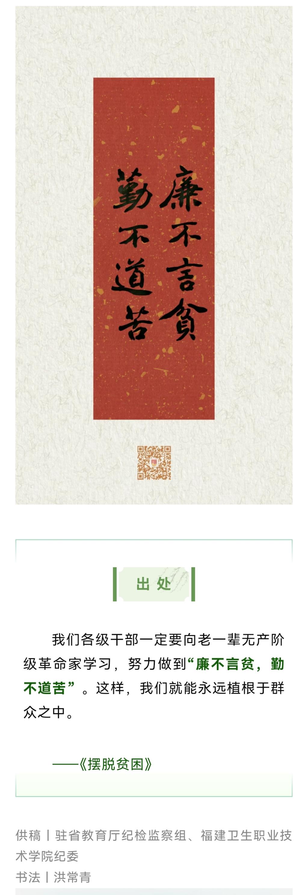 5月24日,“福建纪检监察”微信公众号推送学校选送的“学习廉语”——“廉不言贫,勤不道苦”。