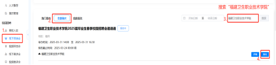 2.未注册平台的单位,点击报名链接,点“单位登录/注册”进行注册,填写并上传注册资料,企业认证审核通过后在“校园招聘-线下双选会”全部场次中搜索“福建卫生职业技术学院2025届毕业生春季校园招聘会”(如下图)