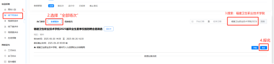 2.未注册平台的单位点击报名链接,点“单位登录/注册”进行注册,填写并上传注册资料,企业认证审核通过后在“校园招聘-线下双选会”全部场次中搜索福建卫生职业技术学院2025届毕业生夏季校园招聘会邀请函”(如下图)