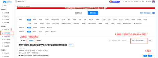 2.未注册平台的单位点击报名链接,“单位登录/注册”进行注册,填写并上传注册资料,企业认证审核通过后在“校园招聘-线下双选会”全部场次中搜索“福建卫生职业技术学院2026届毕业生校园招聘专场”(如下图)