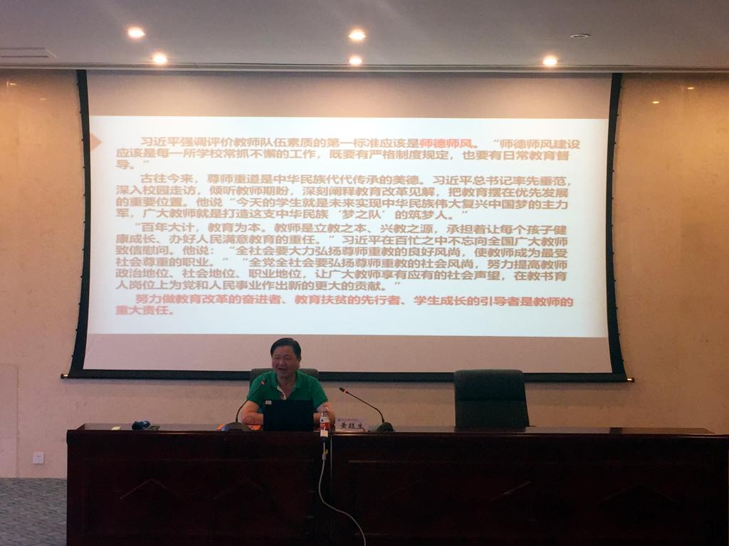 10月6日下午,黄旺生教授以《弘扬高尚师德,做一名人民满意的高校教师》为题,通过活泼生动、睿智感人的教育事迹,娓娓道出了一名老教师对教师职业和师德修养的理解与感悟,分享了自身从教数十年的喜怒哀乐和酸甜苦辣,阐明了师德的重要性和基本要求,并勉励青年教师要认真履行教书育人的神圣使命。