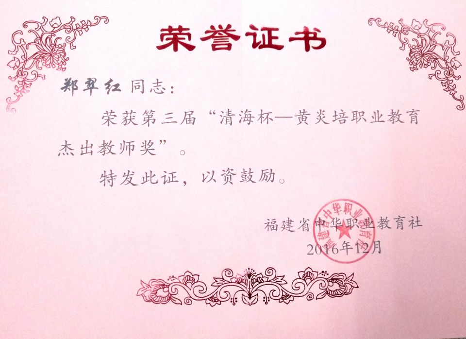 根据《关于表彰第三届“清海杯—黄炎培职业教育奖”获奖单位和个人的决定》(闽职社[2016]55号),我院郑翠红教授获得第三届“清海杯-黄炎培职业教育奖”杰出教师奖。