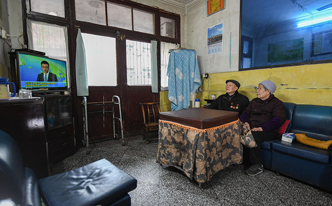 图为张富清和老伴在住了几十年的老房子里看电视。