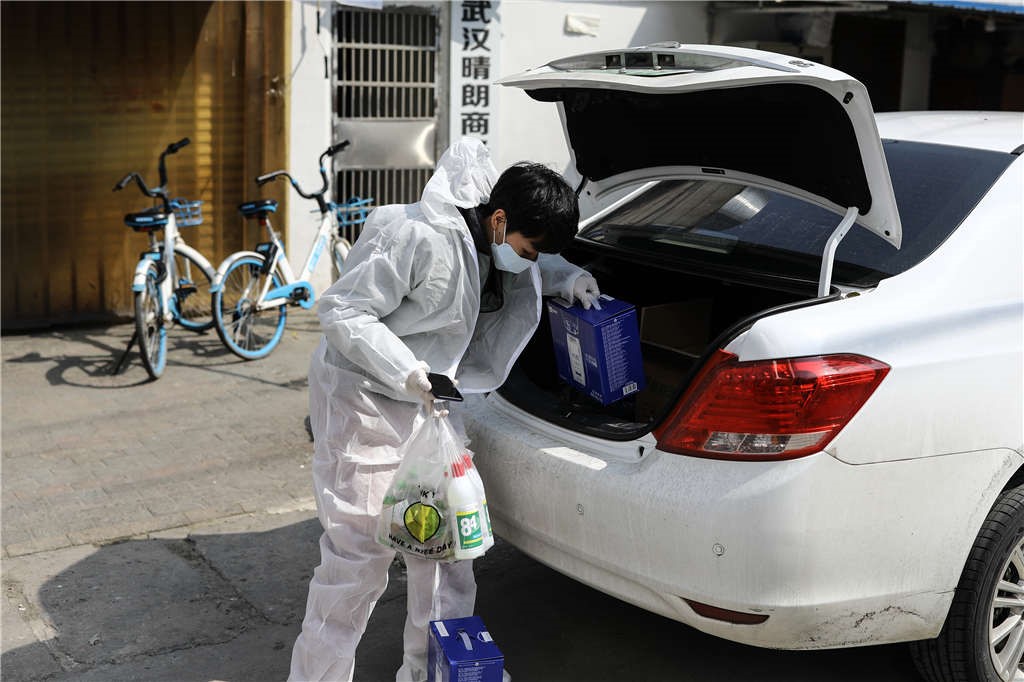 王利在搬运带给社区居民的物品