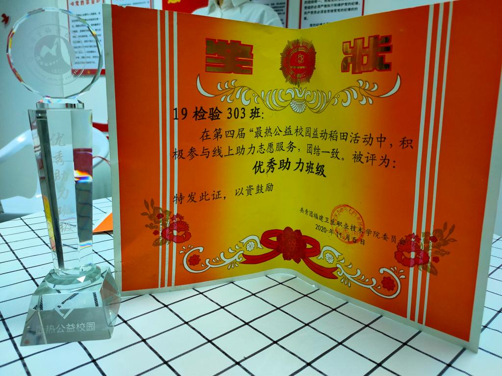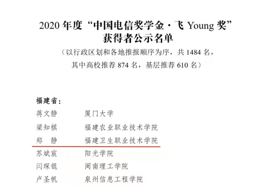 近日,2020年度“中国电信奖学金”名单公布。经校级推荐,省级初评和全国评审,确定 “中国电信奖学金•飞Young奖”获得者1484名。我校19检验303班郑静同学在评选中脱颖而出,获得“中国电信奖学金·飞Young奖”。