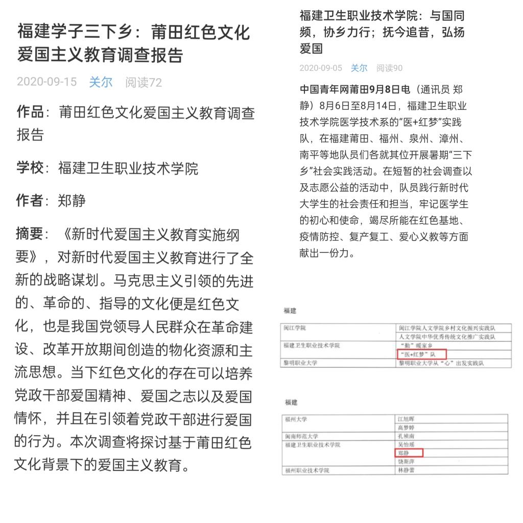 郑静,福建卫生职业技术学院医学技术系学生,入党积极分子,曾任系团总支学生副书记、医学技术系业余分党校班长、班级团支部书记,现担任中国人民解放军联勤保障部队第九〇〇医院检验专业实习队长。