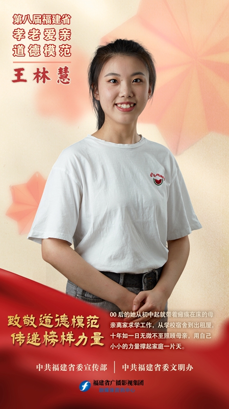 王林慧,女,2002年12月出生,我校22届护理专业校友,预备党员。当同龄孩子还在父母怀里撒娇时,她已需要面对母亲长年瘫痪在床、父亲身体欠佳长期住院的困境,早早扛起家庭重担。从初中起,她就带母离家求学。十年来,从学校宿舍、医院到出租屋,她始终如一、无怨无悔照顾母亲,事事亲为,用实际行动诠释着女儿的爱与担当。曾获得2022年第四季度“中国好人”、2022年第三季度“福建好人”、第六届宁德市道德模范、2020年度“中国大学生自强之星”、2020至2021学年国家励志奖学金、第三届宁德市“尊老孝亲”美德少年、宁德市“向上向善好青年”、宁德市第三届留守流动儿童“自强之星”等。