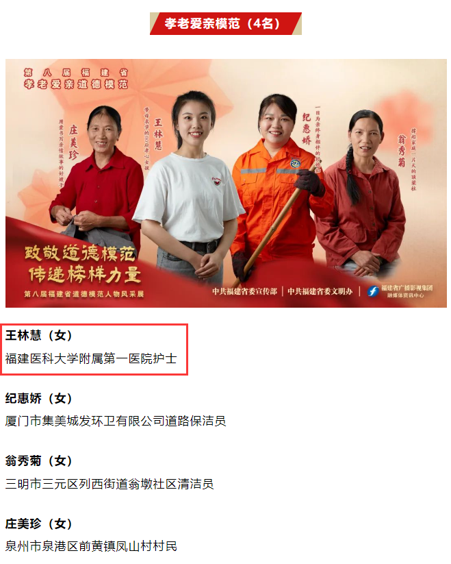 近日,福建省精神文明建设指导委员会印发《关于表彰第八届福建省道德模范的决定》,我校22届护理专业校友王林慧获“孝老爱亲模范”荣誉称号。