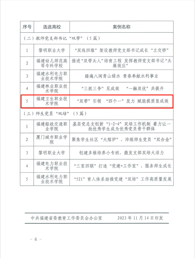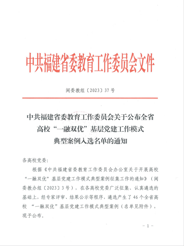 近日,中共福建省委教育工委公布全省高校“一融双优”基层党建工作模式典型案例入选名单,经专家评审、结果公示等程序,共有46个全省高校“一融双优”基层党建工作模式典型案例入选。