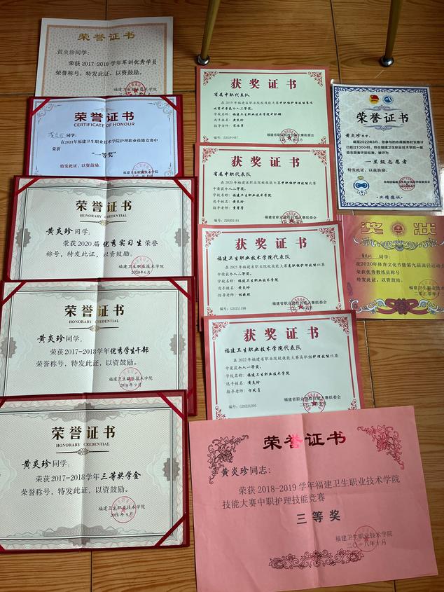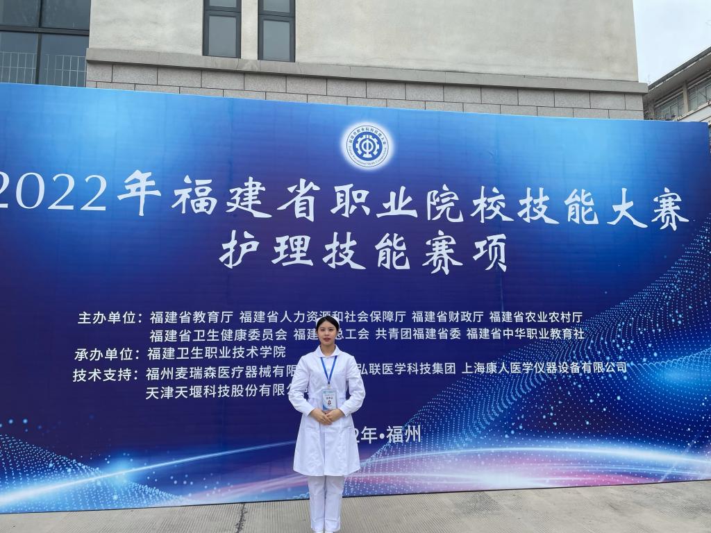 除了优异的学习成绩,黄炎珍还四次代表学校参加省级护理技能竞赛。在高手云集的赛场,黄炎珍一次次挑战自我、超越自我。在备战2022年省赛的一个月里,她只休息了2天,培训老师列出的计划表是,每天从早上7点到晚上10点。黄炎珍经常给自己“加码”,学到凌晨1~2点。最终,她凭借日常的刻苦训练和赛场中“魔鬼般”的细节,以超越第二名2分的“断层式”领先,稳稳夺得一等奖第一名。