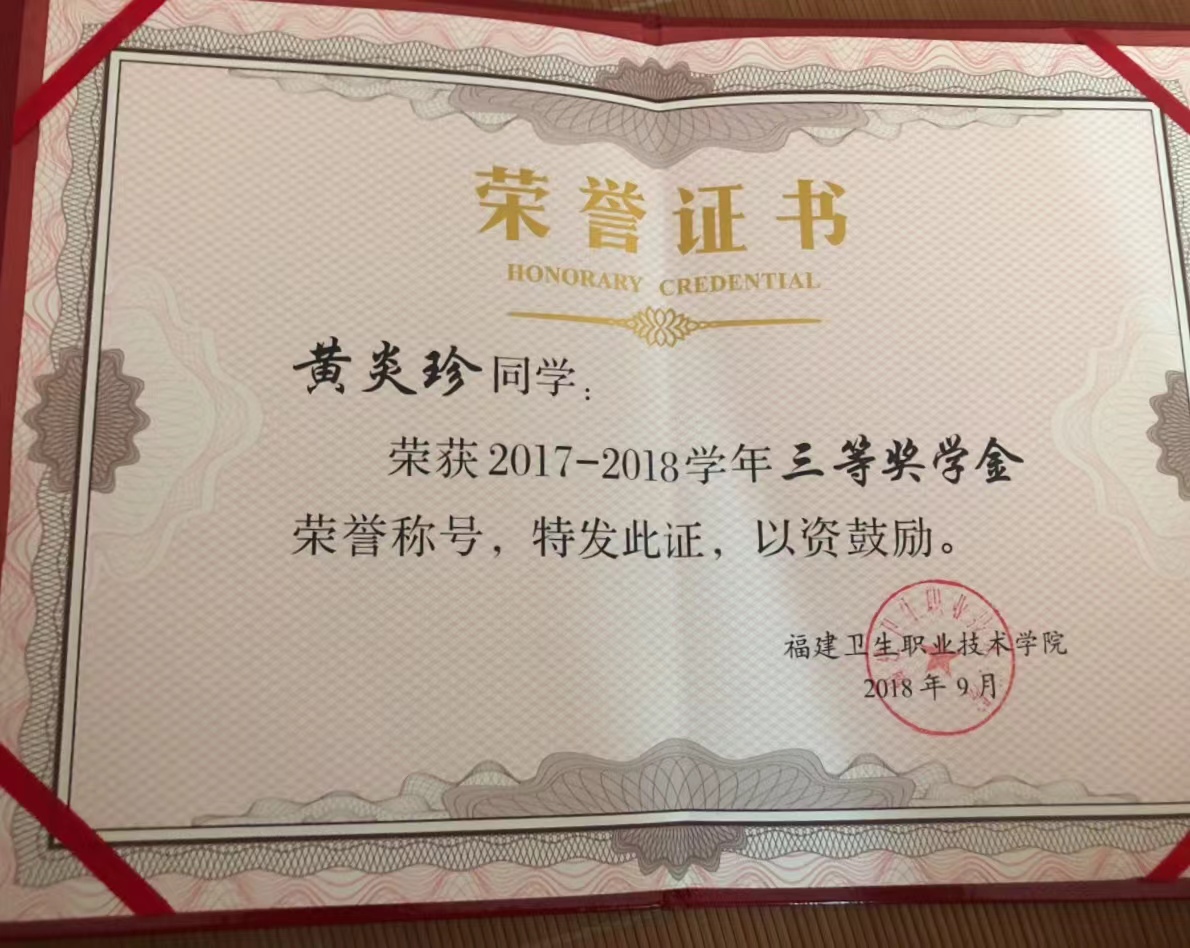 在大学期间,黄炎珍总是以饱满的热情迎接生活及学业的挑战,她目标明确,凭借着勤奋刻苦的学习态度和追求卓越的强大动力取得了优异成绩,荣获2017-2018学年“三等奖学金”、2017-2018学年“优秀学生干部”等荣誉。
