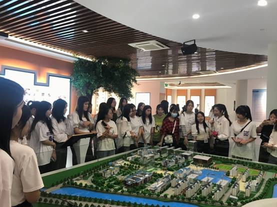 新生在听讲解员介绍我校建筑规模