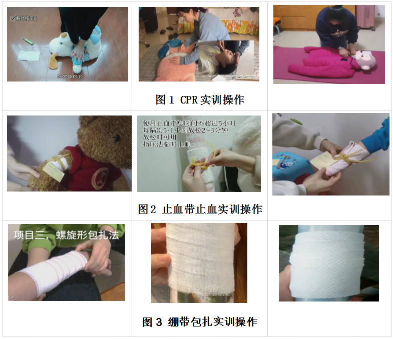 实训在线教学主要通过线上授课→线下实践→线上反馈的模式进行。教师在课前通知学生根据自身情况准备实训用物,同学们在求助家人朋友帮助的同时,也发挥自己的聪明才智,各自发掘可用之物,玩偶、枕头、靠垫等充当CPR模拟人,保温杯、扫帚、拖把等止血包扎模拟道具齐上阵。