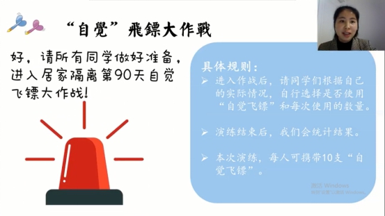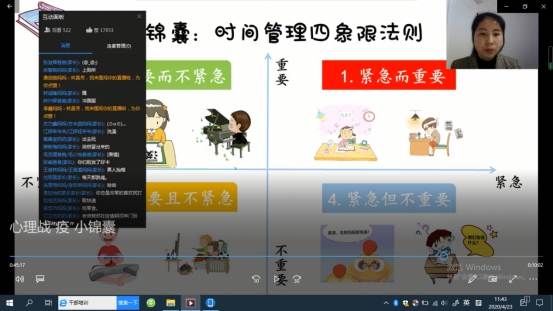 在学生的时间管理方面,夏雪梅老师首先通过“自觉飞镖大作战”的游戏,给各位同学们设置起床、专心做作业、认真听网课等六个居家情境,来测试同学们的自觉以及时间管理的情况,而后通过讲授时间管理四象限法则,提醒同学们重要不紧急的事情要有准备的做,不重要不紧急的事穿插着做,最后也鼓励大家根据四象限法则制作自己的时间作息表。