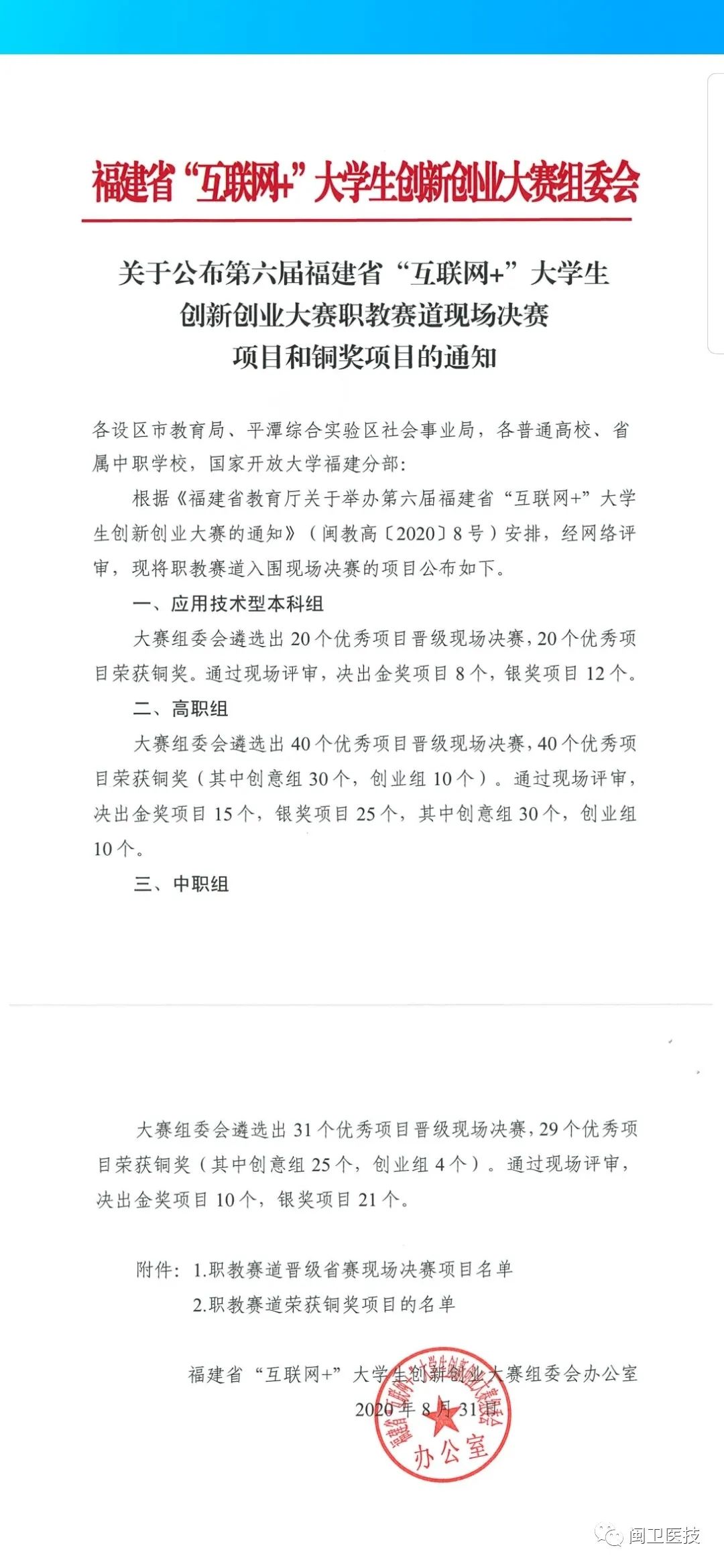 2020年8月31日,第六届福建省“互联网+”大学生创新创业大赛职教赛道暨第四届黄炎培海峡职业教育创新创业大赛省级初赛网评结果公布,我院《械诊港医疗设备维修平台》项目荣获省级铜奖。该项目由医学技术系18影像303班林诗婷、19检验301班邱倩玉、17设备301班卢敏、17设备301班钟林玉、19设备301班刘紫娴、18影像303班朱丽敏、17投资学谢同心(师大协和学院)等七位同学共同,医学技术系钟伟雄老师主要指导。
