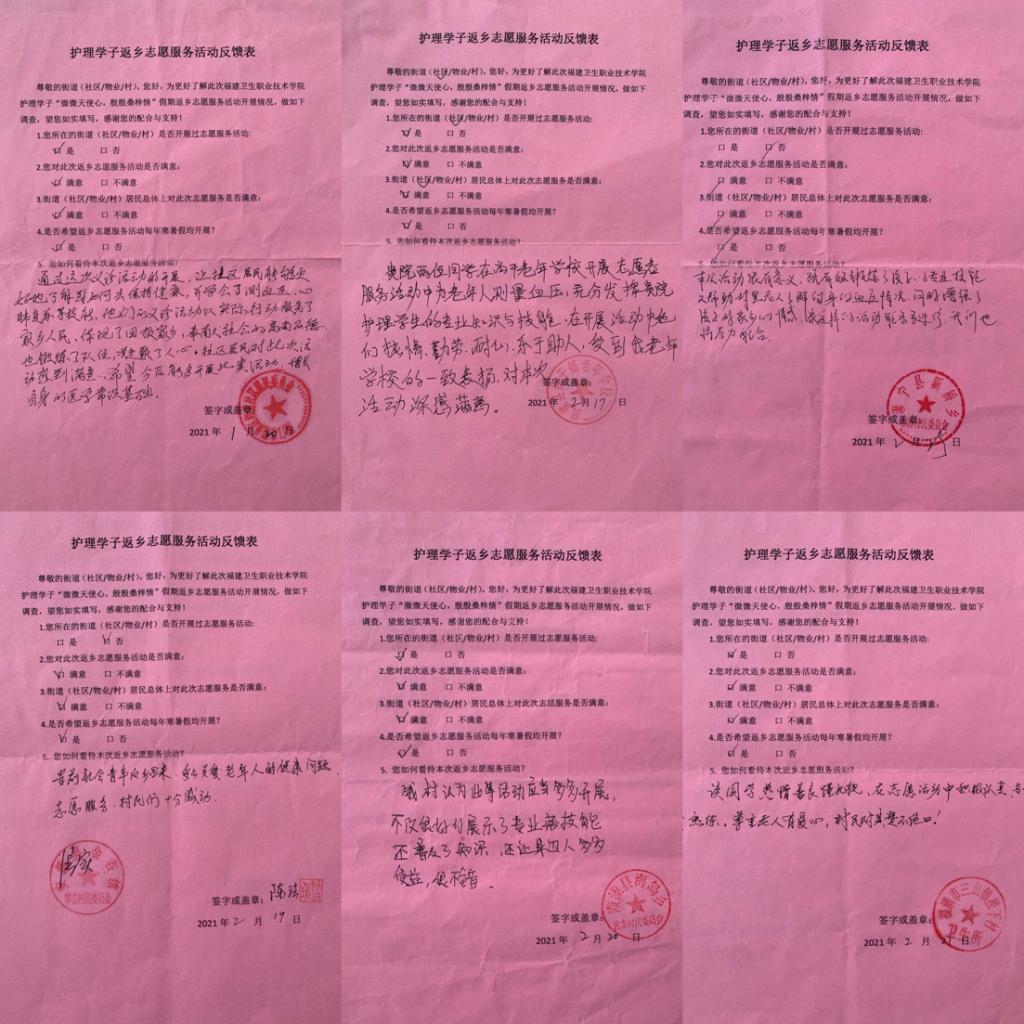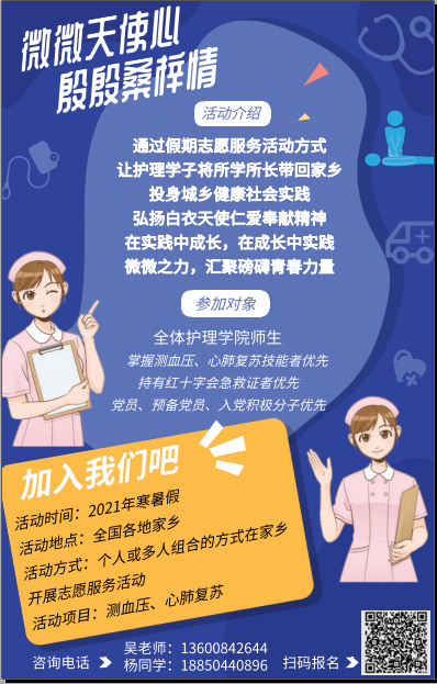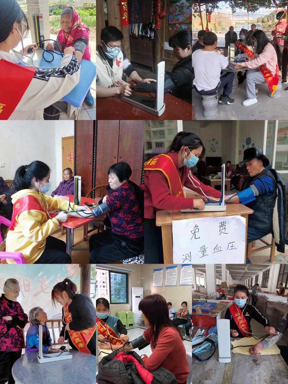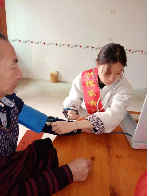 “来,阿姨,排好队,保持安静,我们一个个来哦……”, “大哥,您之前都没测过血压是吗?没关系,您放松,我给您测一下”,“爷爷,您的血压是134/76mmHg,血压保持的很好呀,要继续坚持每天按时吃药哦”,“奶奶,您现在的血压有点高,您刚刚走路了是吗,没关系,我明天早上去您家给您测量好吗?我放假期间每天都在家的,您想测量时,叫一声,我就来啦”……庚子鼠年春节之际,在村口、在乡民家里经常可以看到穿着志愿者马甲、披着志愿者绶带的护理学子,微笑、耐心的为乡民们测量血压。