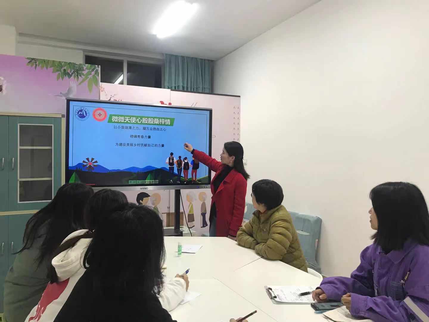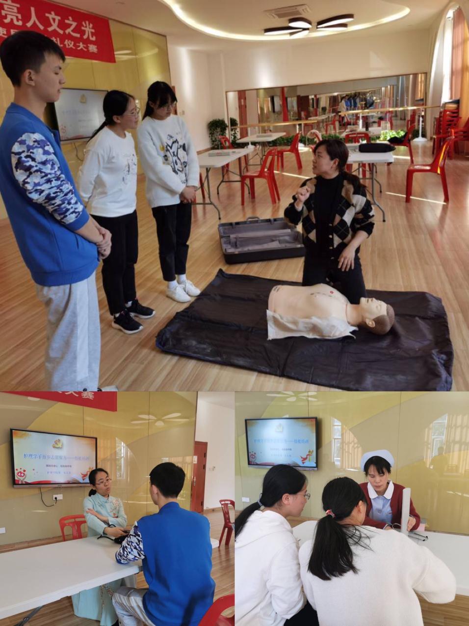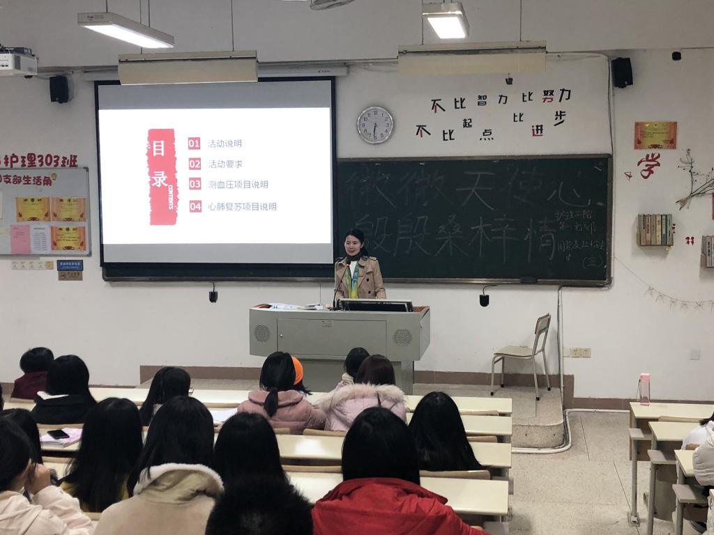 志愿服务活动前培训:护理实训室中,老师们正在细致的培训辅导。测血压前后的各种注意要点,心肺复苏时的重点步骤,人文关怀要如何进行……