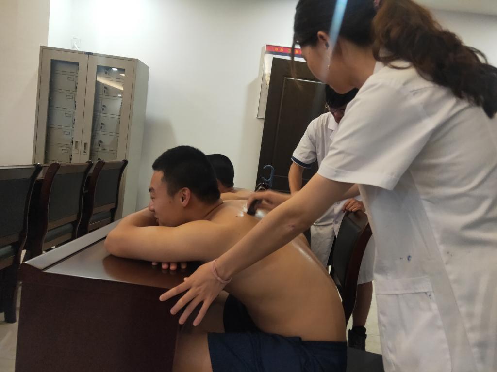 活动开始,由医学系红十字会负责人王婷同学为消防员们详细讲解绷带三角巾包扎法的理论知识,其余同学依次演示急救中常用的头部、胸部、手部、膝盖等部位的三角巾包扎手法。随后,消防员们两人一组在同学们的指导下进行包扎实践训练。最后,师生现场为消防员们提供刮痧拔罐义诊活动。