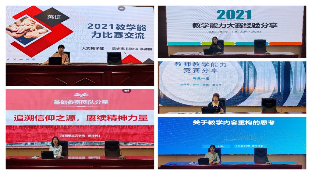 本次交流会共有5位获奖教师代表和1位评委代表上台发言。来自人文教学部的黄光惠老师围绕参赛团队(人和)、时间管理(天时)、参赛场地(地利)、赛后反思四个部分进行交流。马克思主义学院的颜冰凤老师重点分享了在教师教学能力比赛中有关课程整体设计,尤其是课程选题的重要性。来自药学院的张丽华与刘丹丹两位老师结合各自团队在拍摄教学视频过程中遇到的教学材料组织、视频拍摄以及有关信息泄露的问题,分享了课程重组、视频拍摄场景选取以及严防细查信息泄露的重要性。护理学院获奖团队代表林旭星老师分享了在课程选题的过程中要充分展现学科和专业的校本特色,才更有机会在比赛中取得优异的成绩。